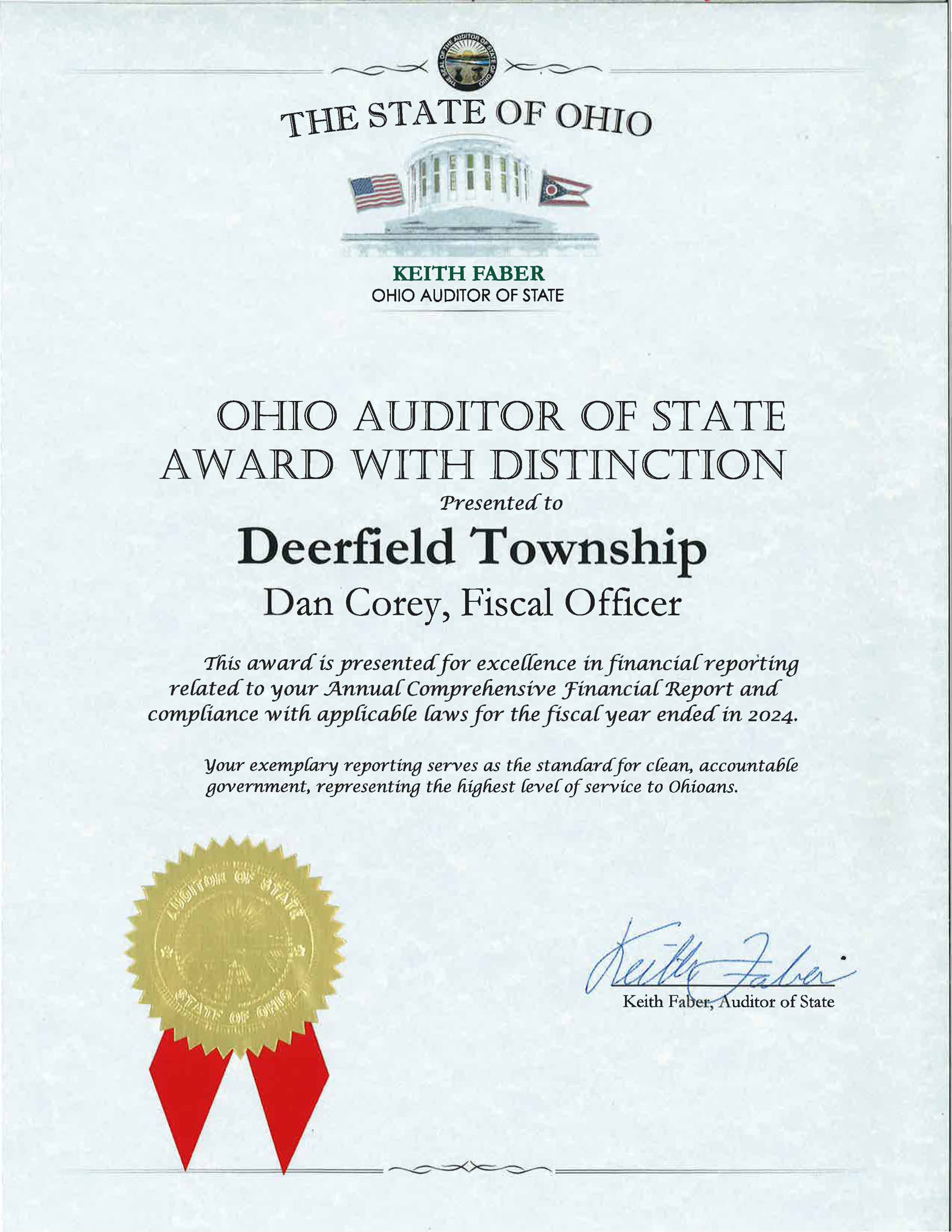 Deerfield Township Earns Fourth Consecutive Auditor of State Award with Distinction